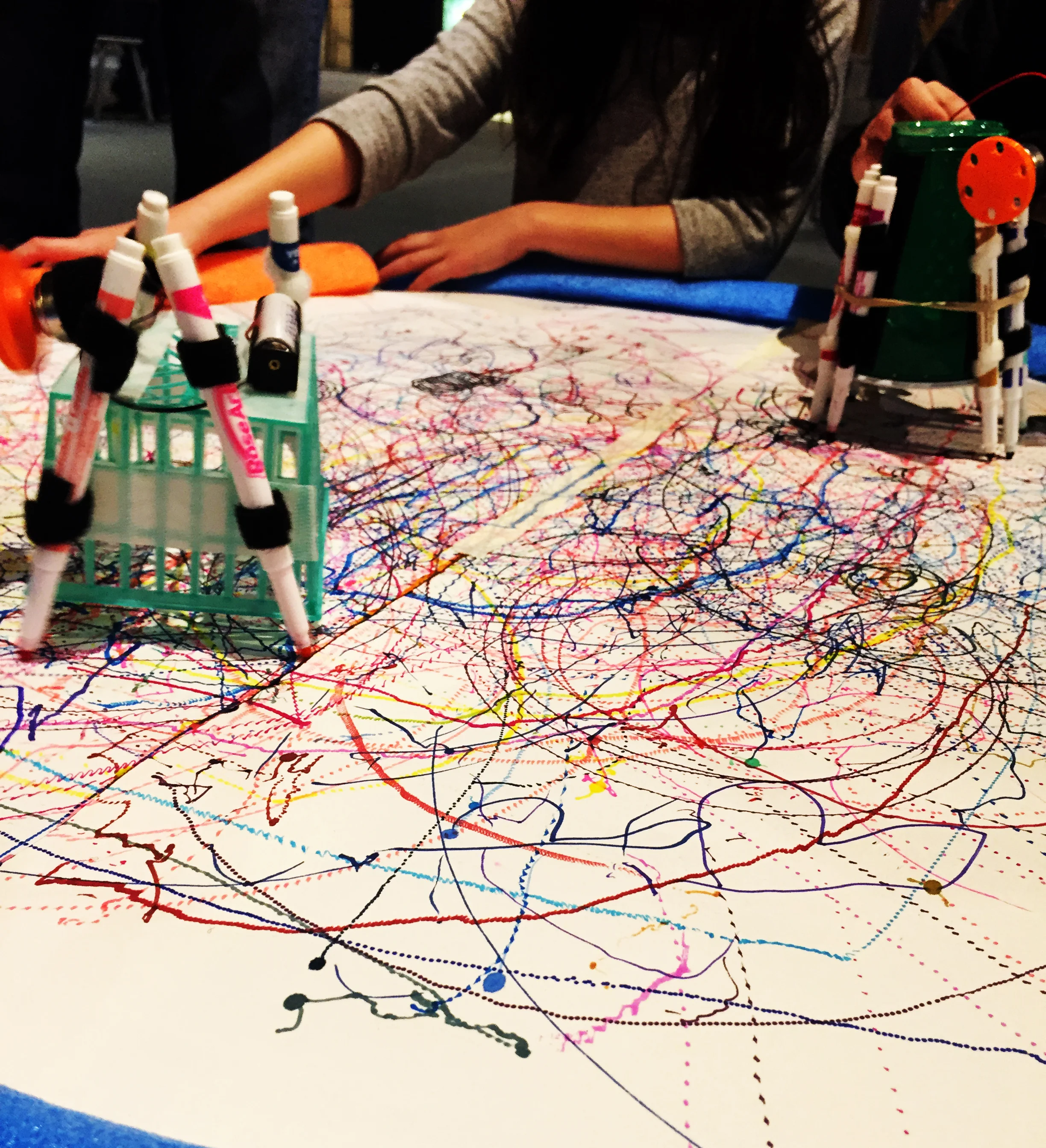 Craft store items such as straws, pipe cleaners, and markers are essential components to draw bots.  Users can customize each bot with these materials to create different patterns on the paper.   View fullsize