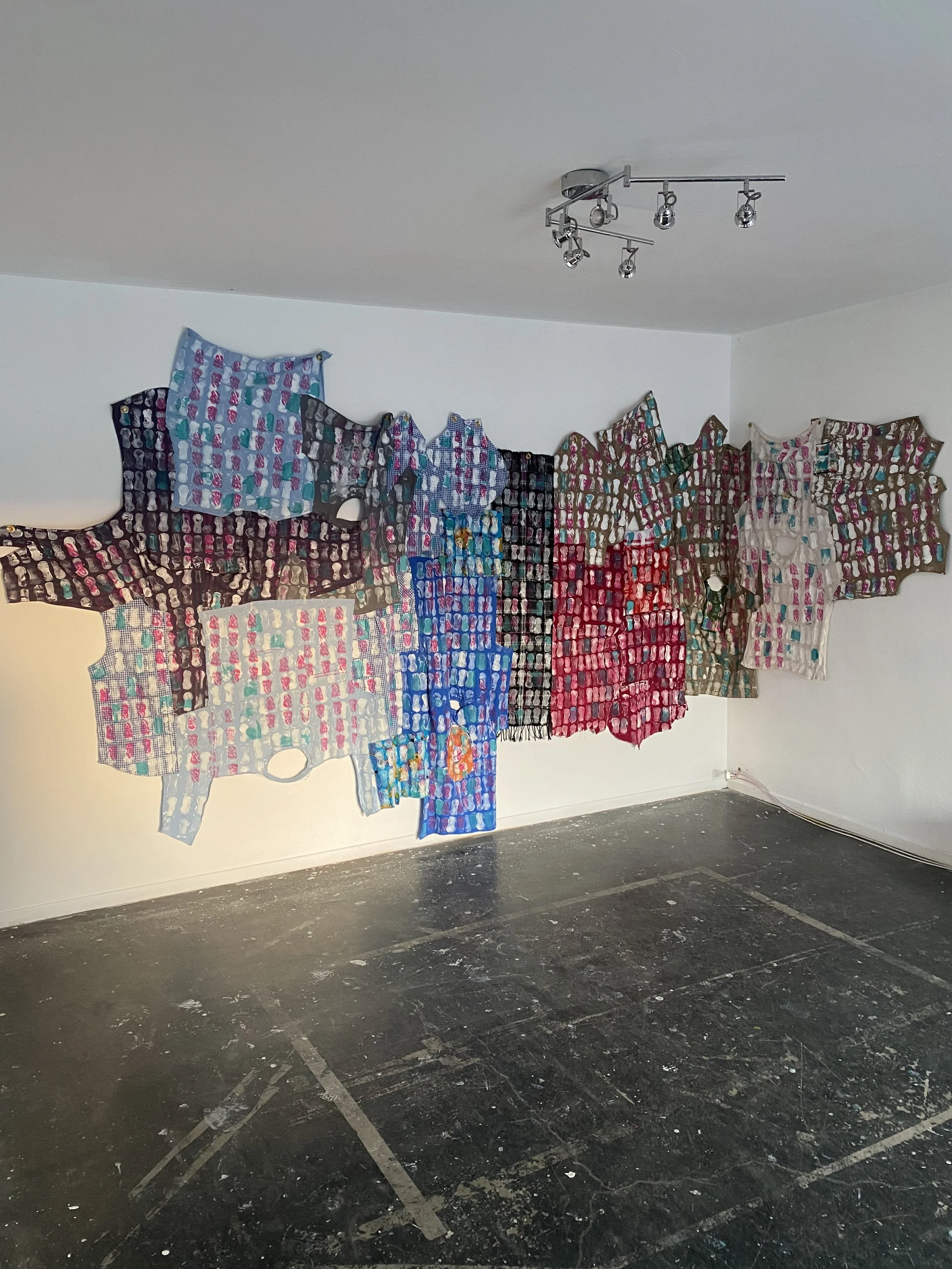 LDGL is an art installation inspired by a collection of poetry written between the years of 2018-2019. I spent months collecting clothes from people who were hanging onto these items that were from former lovers. I sat down and interviewed each individual who spoke on why they kept the piece. Each item of clothing was deconstructed and stitched together to create a tapestry with the same block printed pattern.